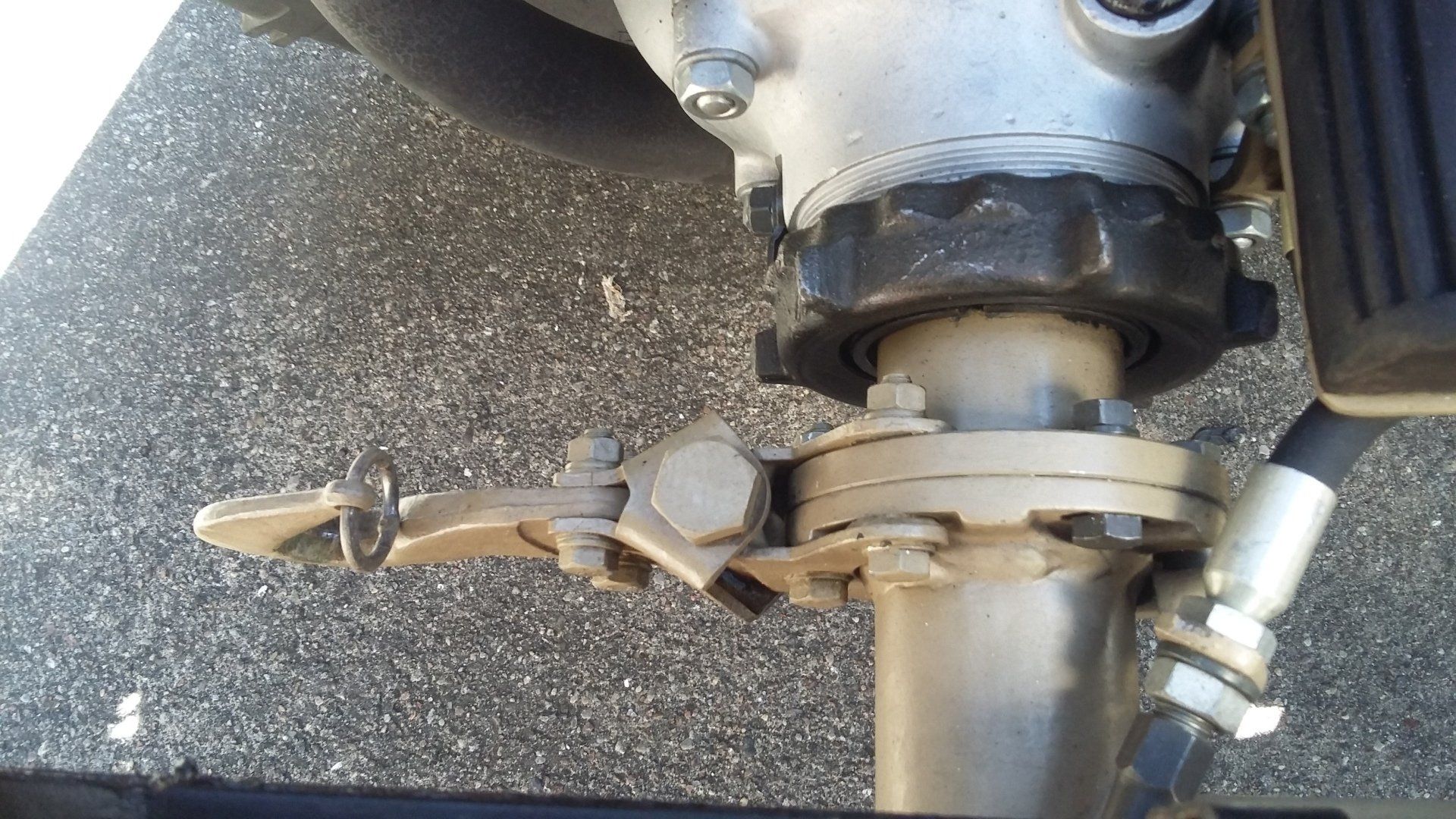 Die drei Befestigungsschrauben bzw. deren Muttern empfehle ich mit Sicherungsmittel anzusetzen ( Federringe brechen sehr gerne, oder weiten auf… ). Die zentrale Befestigungsschraube bzw. die Mutter M14 zwingend mit Sicherungsmittel ansetzen und nur so fest anziehen das der Haken unter händischem Druck sich gerade noch bewegen/ drehen lässt.